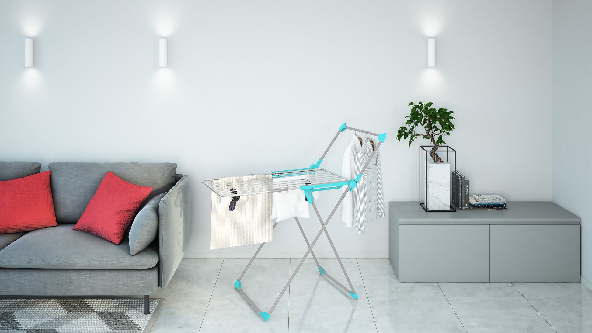 - Built-in 60cm rod holds up to 15 hangers for wrinkle-free drying