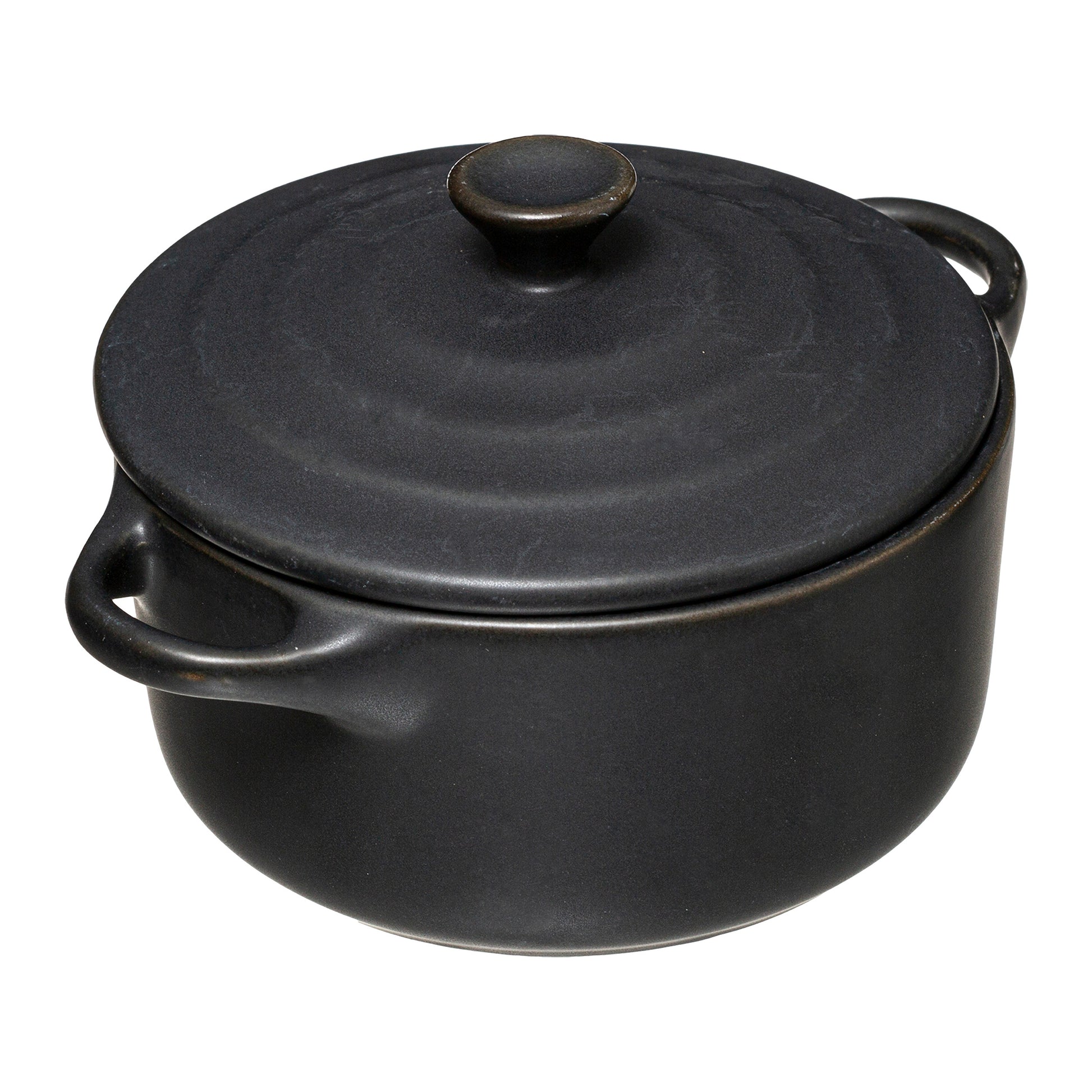 Mini ceramic casserole with lid, 10 cm diameter and compact W 13 x D 9.7 x H 7.7 cm, ideal for presenting appetizers, sauces and single portions. Stoneware construction provides durable, even heat retention; oven, microwave and dishwasher safe. Food-contact safe finish, available in Black, Green, Red and Taupe. Twin handles and fitted lid ensure easy serving and stylish presentation.