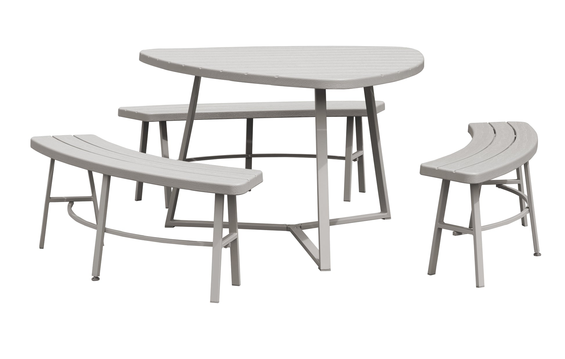 - Heart-shaped table and three curved benches seating six