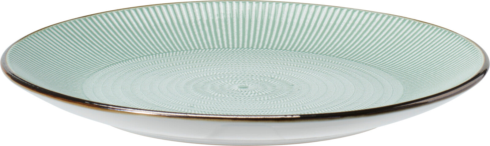 27 cm x 3 cm stoneware (gres) dinner plate with an embossed Winter Garden design and an reactive glaze finish for subtle surface variation; features a contrasting brown rim accent and a finely textured interior. Available in Green, Grey and Pink, this plate pairs decorative detail with practical everyday use.