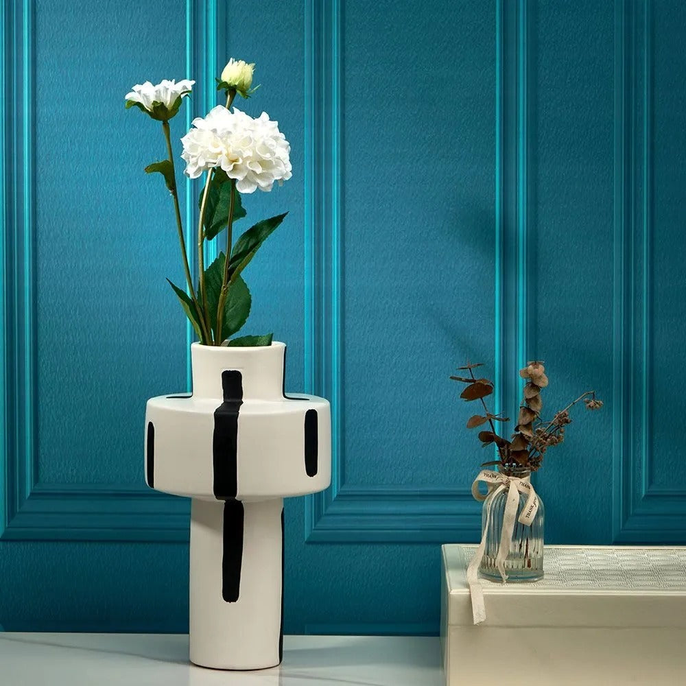 Enhance your space with this Vertical Bar Ceramic Vase, featuring a striking white finish with bold black vertical bars for a modern, artistic look. Expertly crafted from high-quality ceramic, this vase stands out with its unique geometric silhouette and elegant pattern, making it a versatile accent for living rooms, bedrooms, or offices. Generous dimensions allow for eye-catching floral arrangements or use as a stand-alone statement piece, blending seamlessly with both contemporary and classic décor.